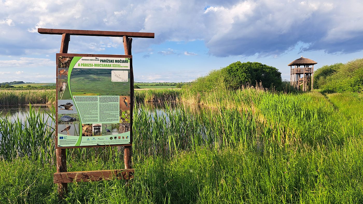 Informačná tabuľa a zrekonštruované vyhliadková veža v CHVÚ Parížske močiare