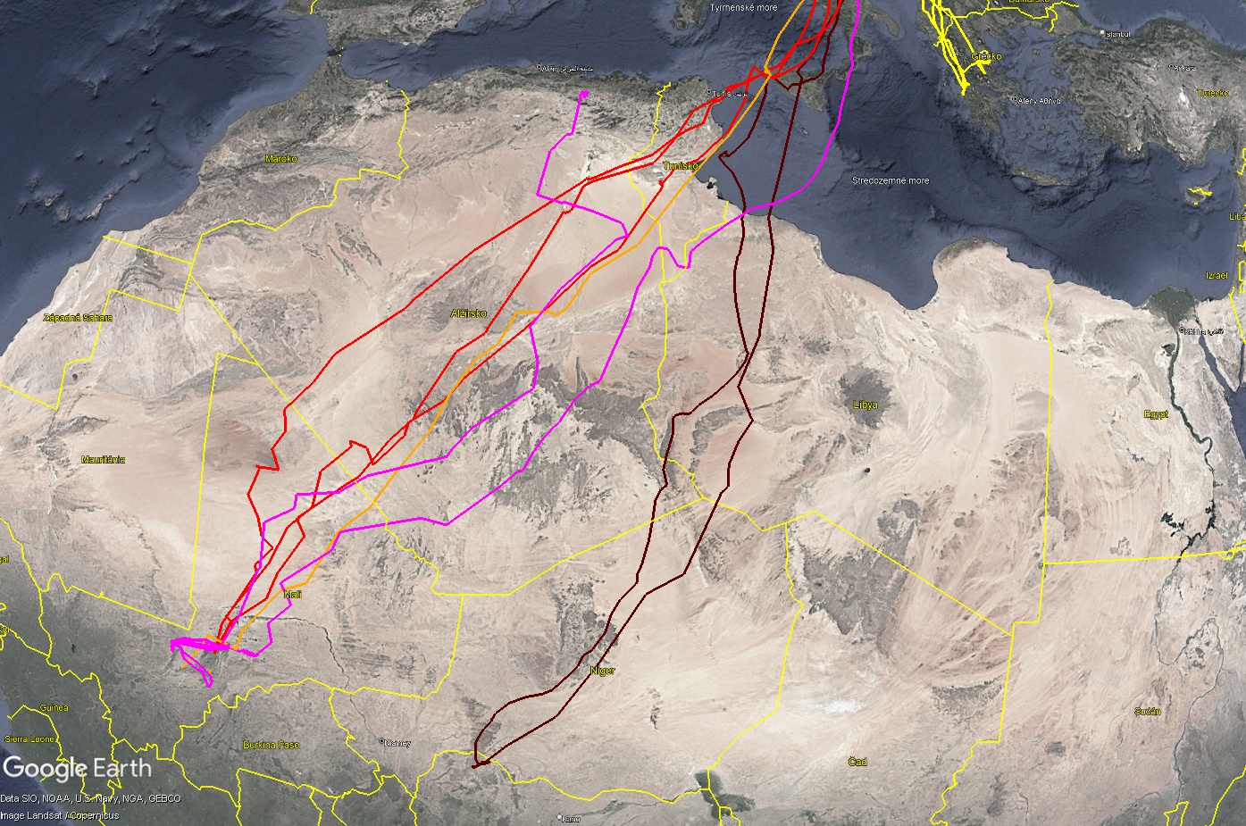 Migračné trasy označených kaníá močiarnych do Afriky a Stredomoria